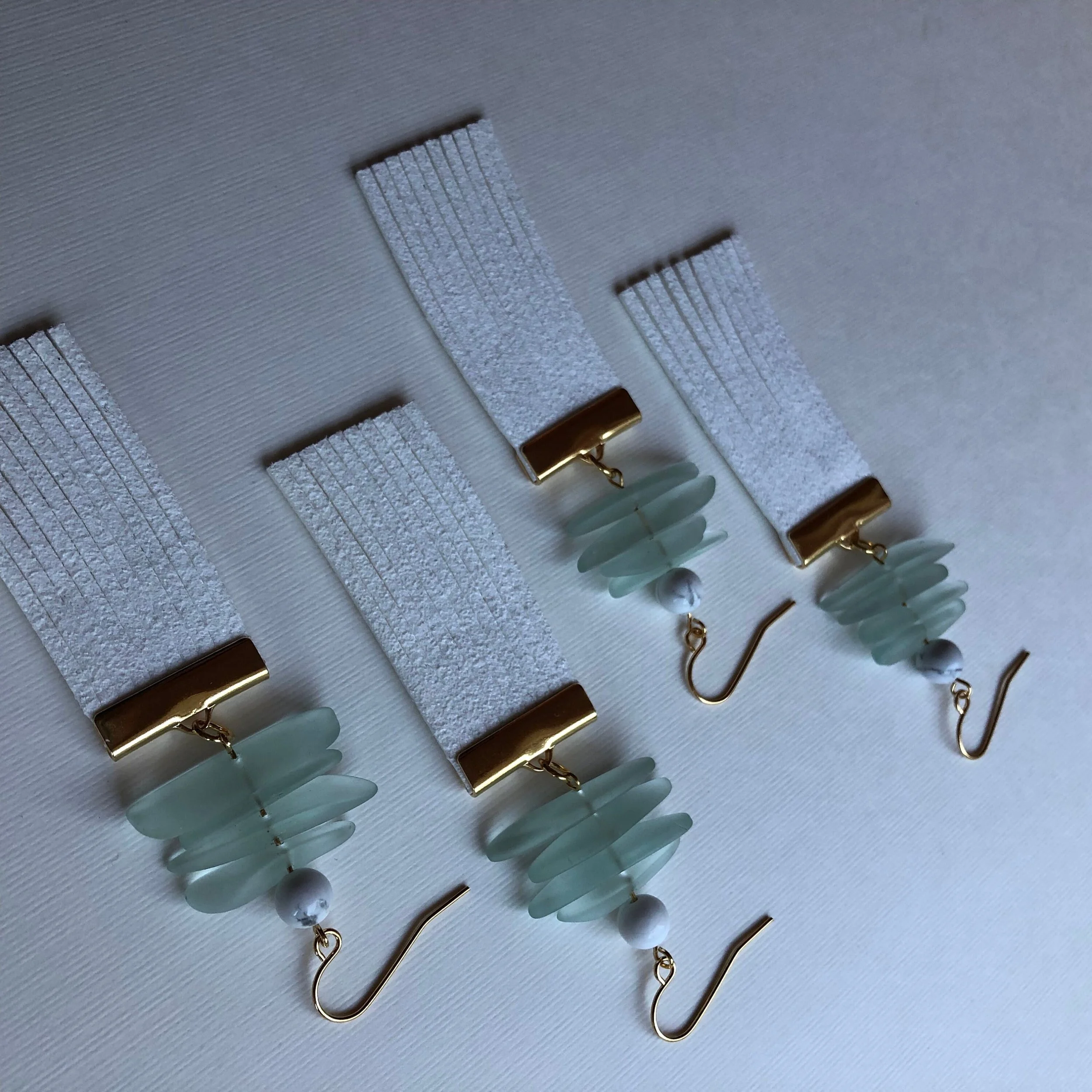Oblong, organically shaped sea glass is stacked four high and topped with a round howlite bead. It anchors wide, white faux (vegan!) suede fringe set in a gold frame. These 3.5 inch long beauties dangle from a 22K gold ear wire. I think they make a beautiful addition to a winter white ensemble just as much as they'd fit right in on a beach getaway!